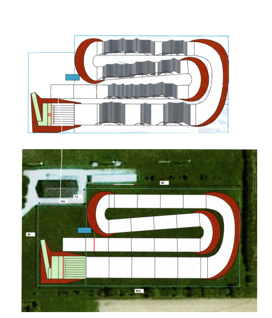 Longueur: 287M, largeur ligne 1: 9M, puis 7M